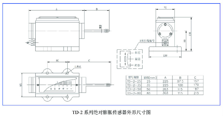 综合举例:订货代号为“TD-2-03-01的产品是指行程0~50mm、不配置相应变送器的TD-2系列绝对膨胀传感器。